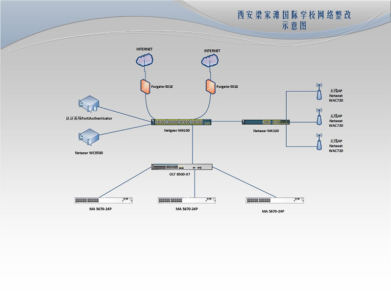 西安梁家灘國際學校是省市重點支持的國際學校,是西北地區第一所由國際文憑組織認證授權的世界 IB(International Baccalaureate)成員學校,是陜西省、西安市政府,高新管委會重點支持的國際教育項目。在這種背景下,成熟的計算機網絡技術和通訊技術為學校辦公自動化、網絡化的需求提供技術支持。辦公局域網為學校營造了一個安全、高效現代化的辦公環境,也使計算機的功能得到了充分的發揮。學校內部聯網實現內部互聯互通,辦公自動化、信息化,有利于數據交換、資源共享、打印共享提高企業效率