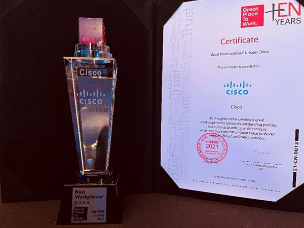 2021年12月1日,北京——思科大中華區在2021年卓越職場?研究所的“最佳職場”評選中榮獲“大中華區最佳職場”第四名的殊榮。“最佳職場”是極具規模的全球權威性職場評選,專為表彰實踐優秀職場文化的企業而設置。思科今年已經連續第五次蟬聯該獎項,是名副其實的“大中華區最佳職場”。